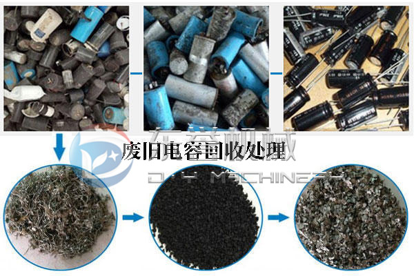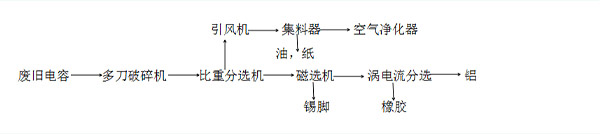 廢舊電容-多刀破碎機-風力比重分選機-渦電流分選機-鋁和紙、塑料。經過多刀破碎機破碎、粉碎、比重分選、渦電流分選工藝。